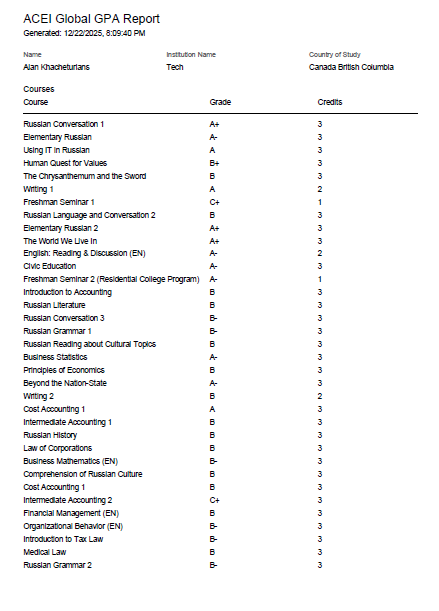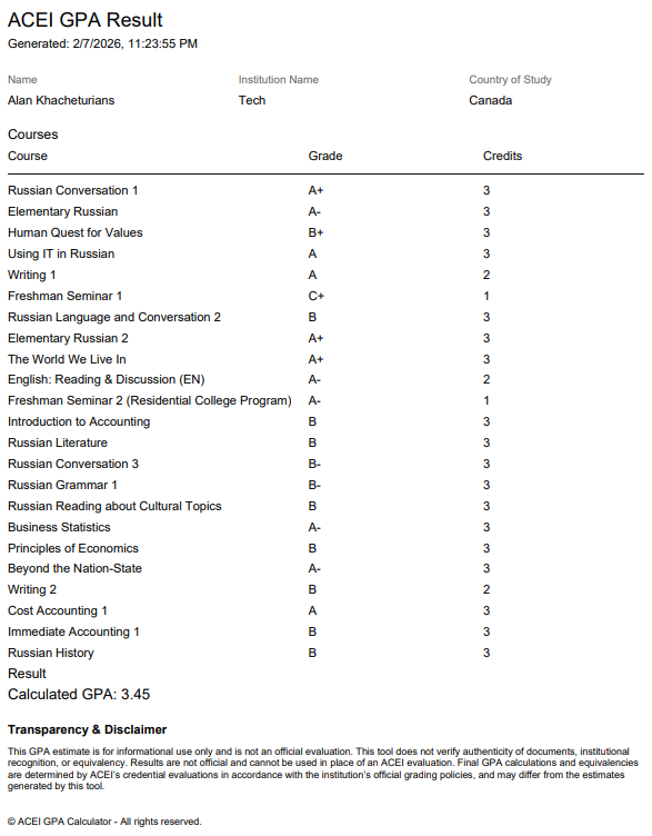 ACEI GPA Calculator © is a fast and easy tool that provides real-time GPA and credit estimates with just a few clicks. Global in scope, it works with academic documents from around the world and offers applicants, universities, and employers a clear snapshot of academic performance. Explore our report options below.