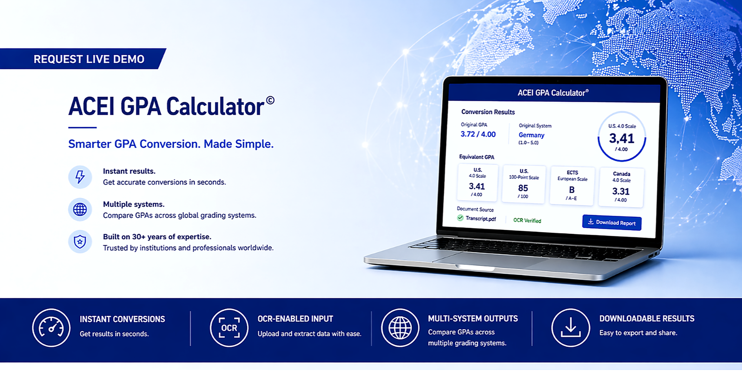 ACEI GPA Calculator © is a fast and easy tool that provides real-time GPA and credit estimates with just a few clicks. Global in scope, it works with academic documents from around the world and offers applicants, universities, and employers a clear snapshot of academic performance. Explore our report options below.